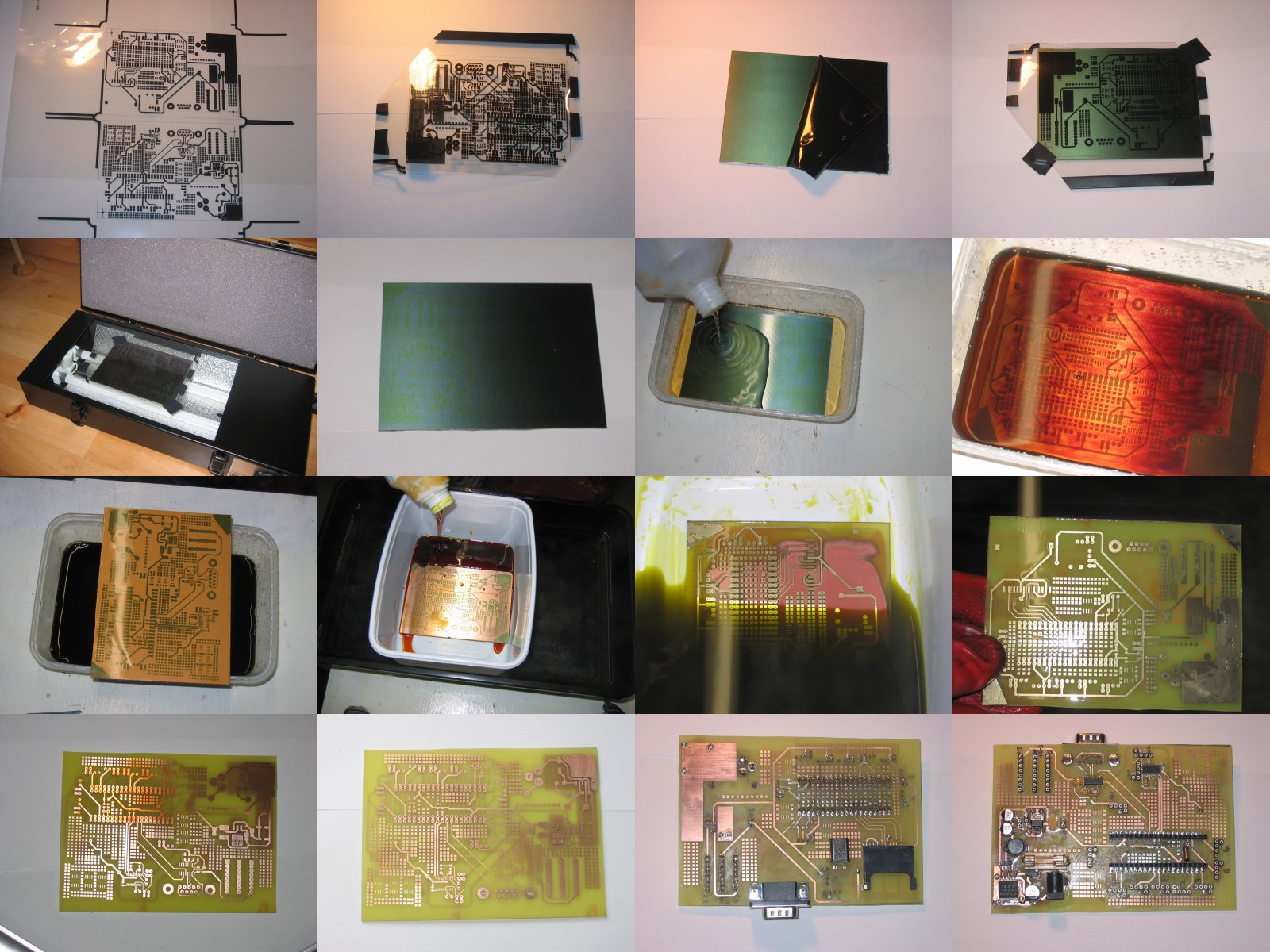 I took a number of photos of the steps I did when going from the circuit board layout to the finished board. I used the photo-resist process to produced a double sided board, I didn't plate the holes but I soldered pins on both sides of the board to join the layers. Notes (almost tutorial) for each photo are from left to right, top to bottom.